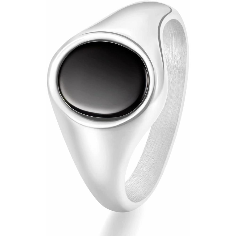TRUMIUM 18K Gold Plated Signet Rings for Men Women Black Onyx inlay Silver Gold Wedding Bands Lightweight Thick Statement Ring Comfort Fit Size 7-13(Oval Silver Plated)