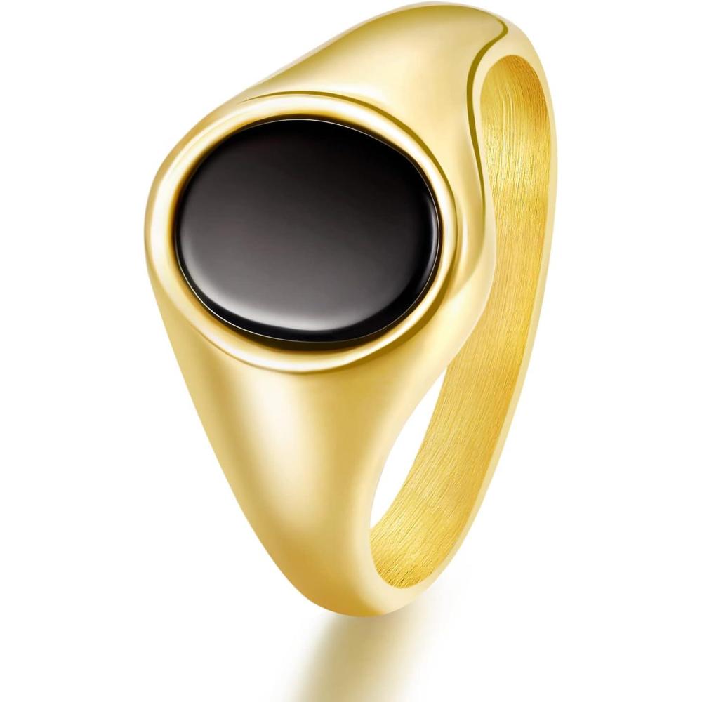 TRUMIUM 18K Gold Plated Signet Rings for Men Women Black Onyx inlay Silver Gold Wedding Bands Lightweight Thick Statement Ring Comfort Fit Size 7-13(Oval Gold Plated)