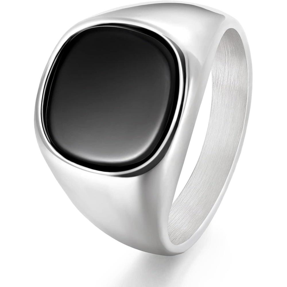 TRUMIUM 18K Gold Plated Signet Rings for Men Women Black Onyx inlay Silver Gold Wedding Bands Lightweight Thick Statement Ring Comfort Fit Size 7-13(Square Silver Plated)