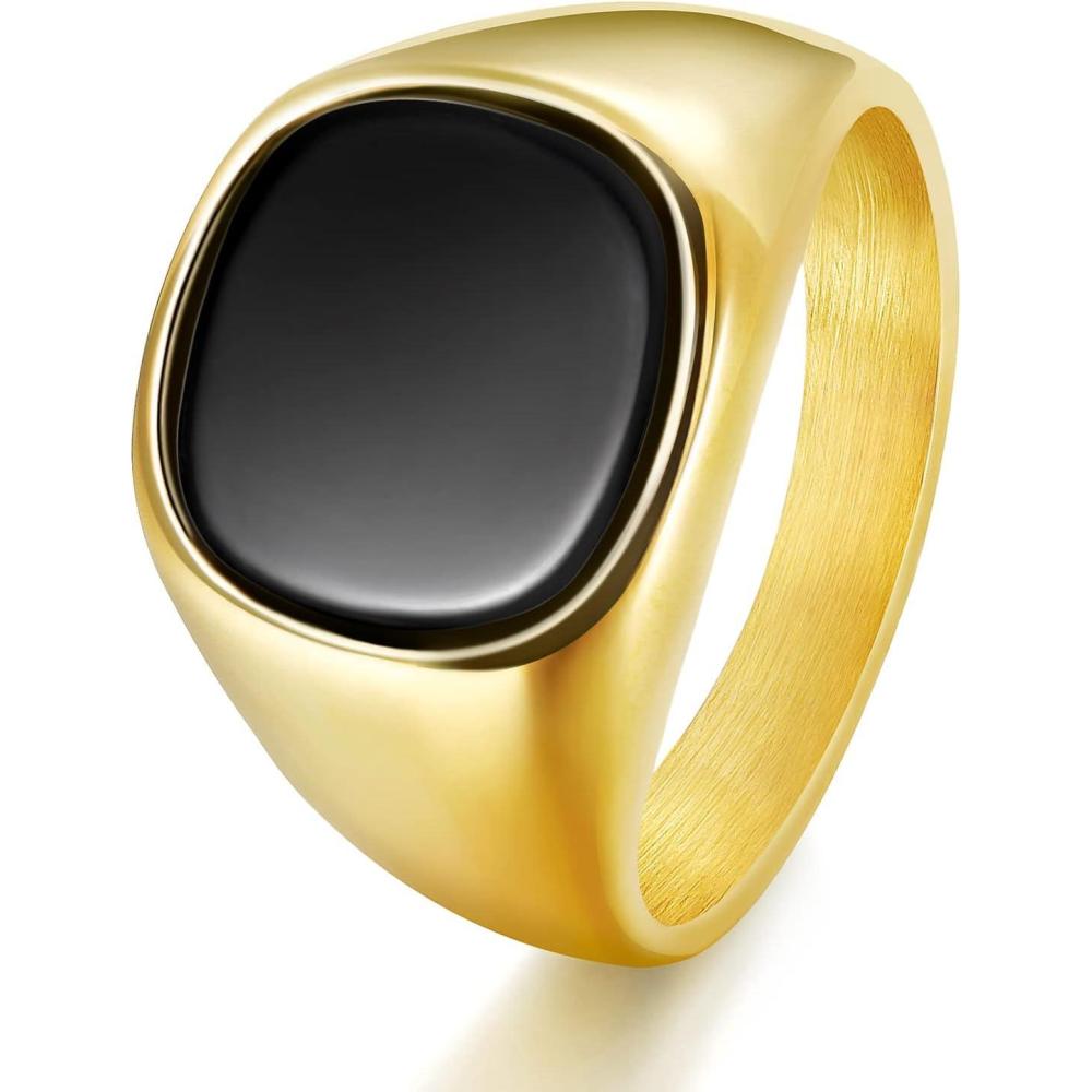 TRUMIUM 18K Gold Plated Signet Rings for Men Women Black Onyx inlay Silver Gold Wedding Bands Lightweight Thick Statement Ring Comfort Fit Size 7-13(Square Gold Plated)