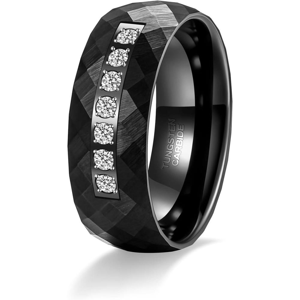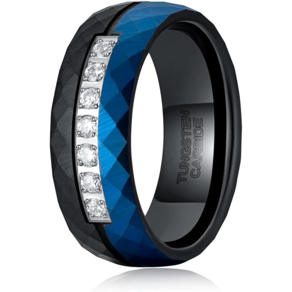 TRUMIUM 8mm Tungsten Rings for Men Women Hammered Black Blue Men’s Rings White Cubic Zirconia Inlay Matte Finished Engagement Promise Wedding Bands Comfort Fit Size 7-13(8mm Black Hammered)