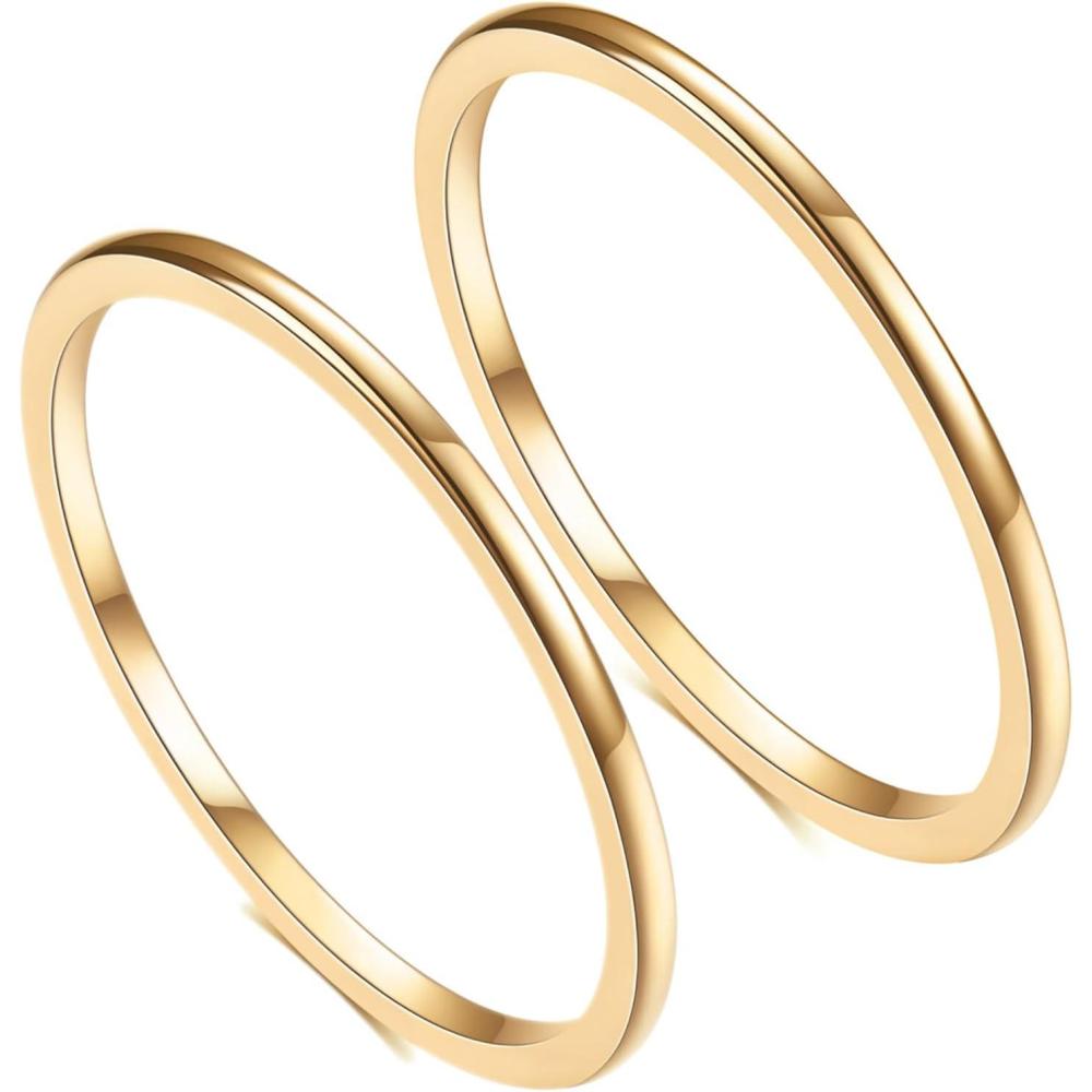 VQYSKO 2PCS 14K Gold Plated Stainless Steel Modern Thin Stackable Band Rings for Women, Size 3-10(Gold-1MM-2PCS)