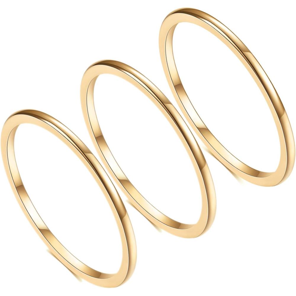 VQYSKO 2PCS 14K Gold Plated Stainless Steel Modern Thin Stackable Band Rings for Women, Size 3-10(Gold-1MM-3PCS)