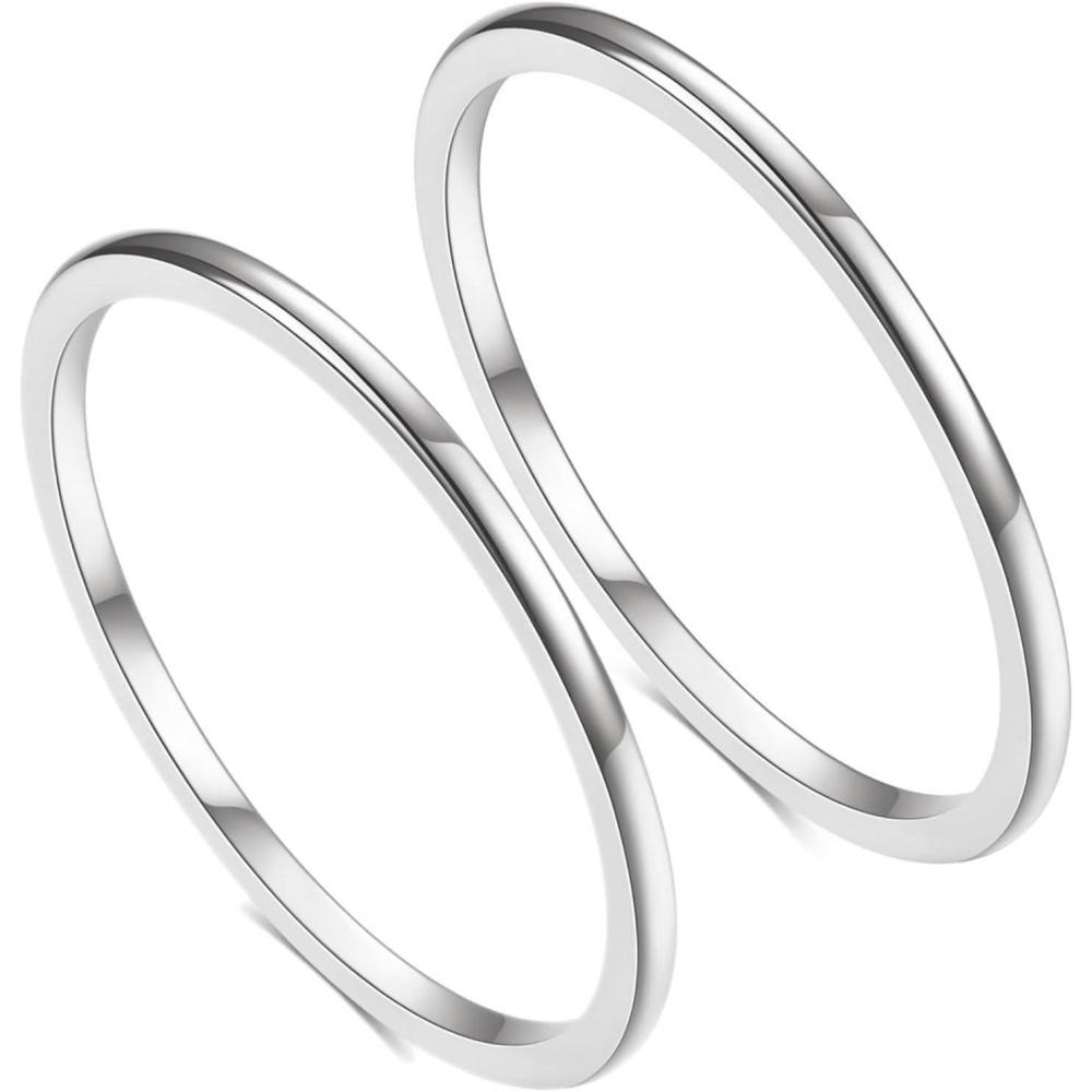 VQYSKO 2PCS 14K Gold Plated Stainless Steel Modern Thin Stackable Band Rings for Women, Size 3-10(Silver-1MM-2PCS)