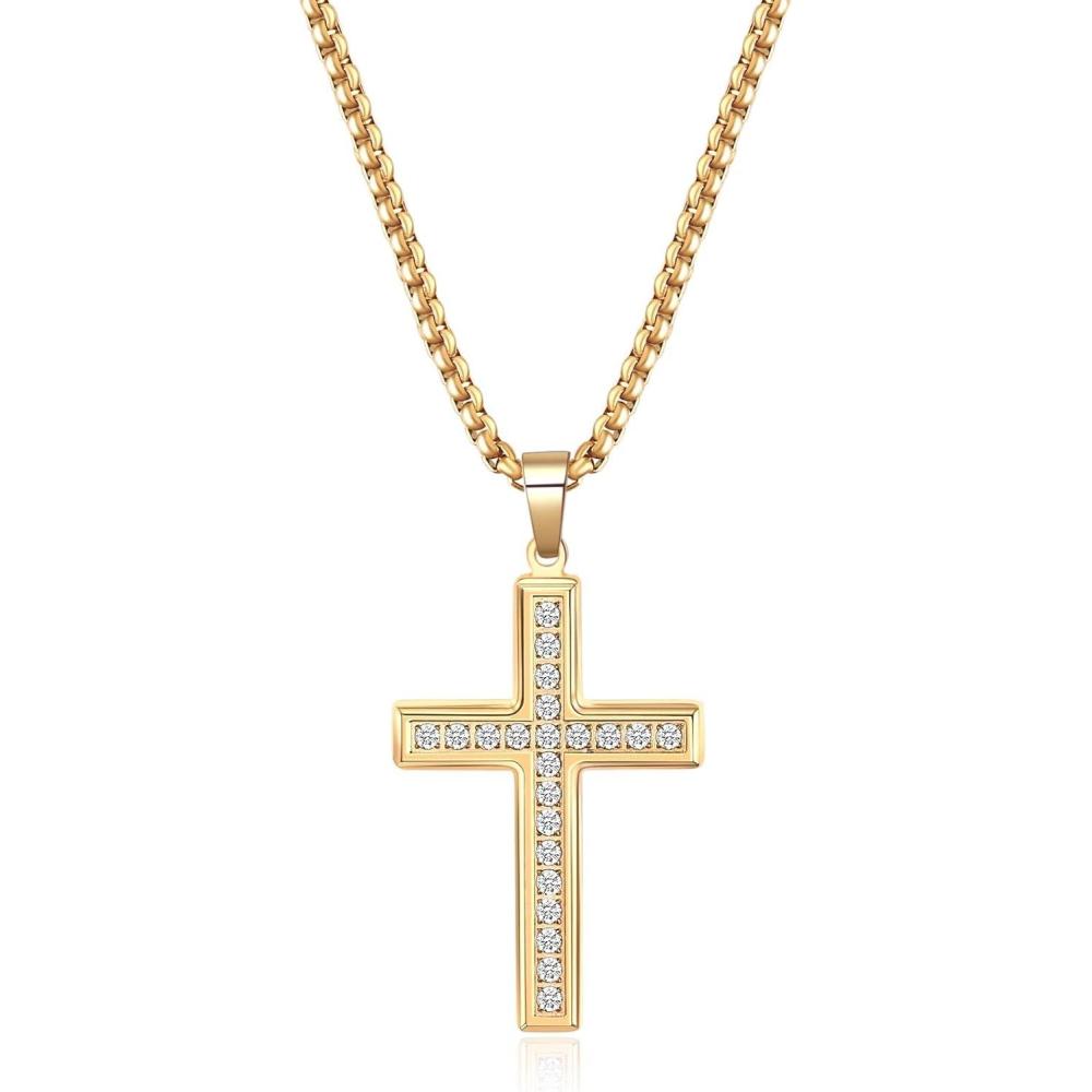 VQYSKO Cross Necklace for Men Women, CZ 14k Gold Plated Stainless Steel Plain Simple Cross Pendant Necklace for Men(CZ Gold)