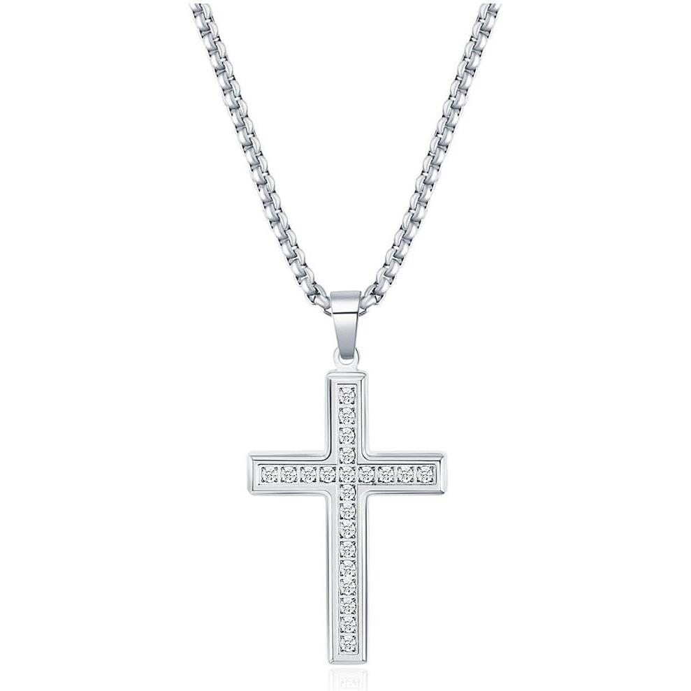 VQYSKO Cross Necklace for Men Women, CZ 14k Gold Plated Stainless Steel Plain Simple Cross Pendant Necklace for Men(CZ Silver)