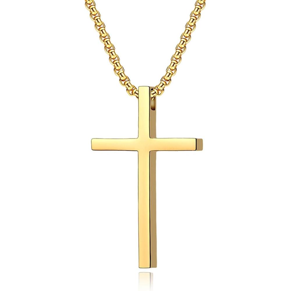 VQYSKO Cross Necklace for Men Women, CZ 14k Gold Plated Stainless Steel Plain Simple Cross Pendant Necklace for Men(Gold)