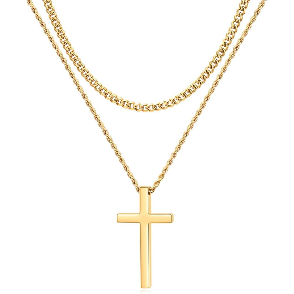 VQYSKO Cross Necklace for Men Women, CZ 14k Gold Plated Stainless Steel Plain Simple Cross Pendant Necklace for Men(Layered Gold)