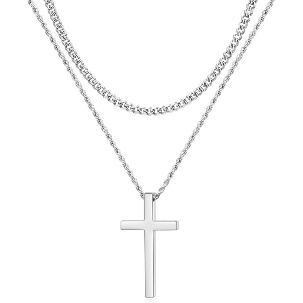 VQYSKO Cross Necklace for Men Women, CZ 14k Gold Plated Stainless Steel Plain Simple Cross Pendant Necklace for Men(Layered Silver)