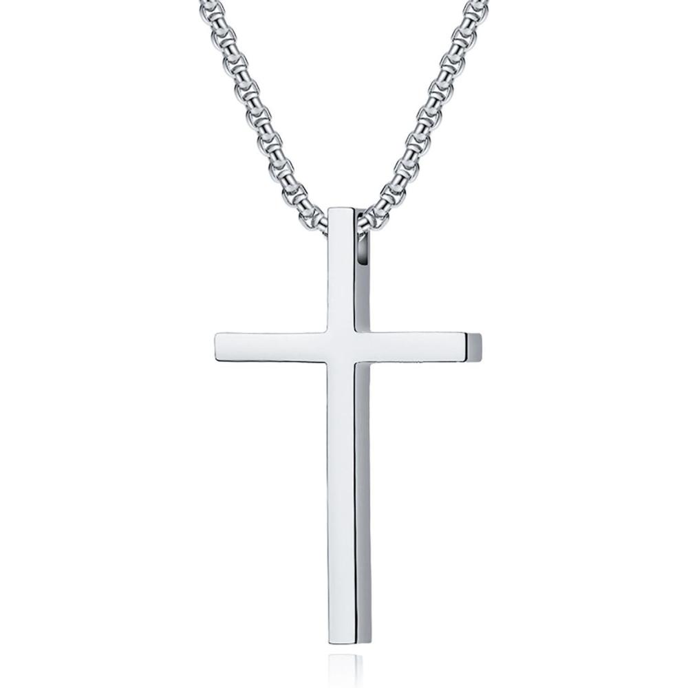 VQYSKO Cross Necklace for Men Women, CZ 14k Gold Plated Stainless Steel Plain Simple Cross Pendant Necklace for Men(Silver)