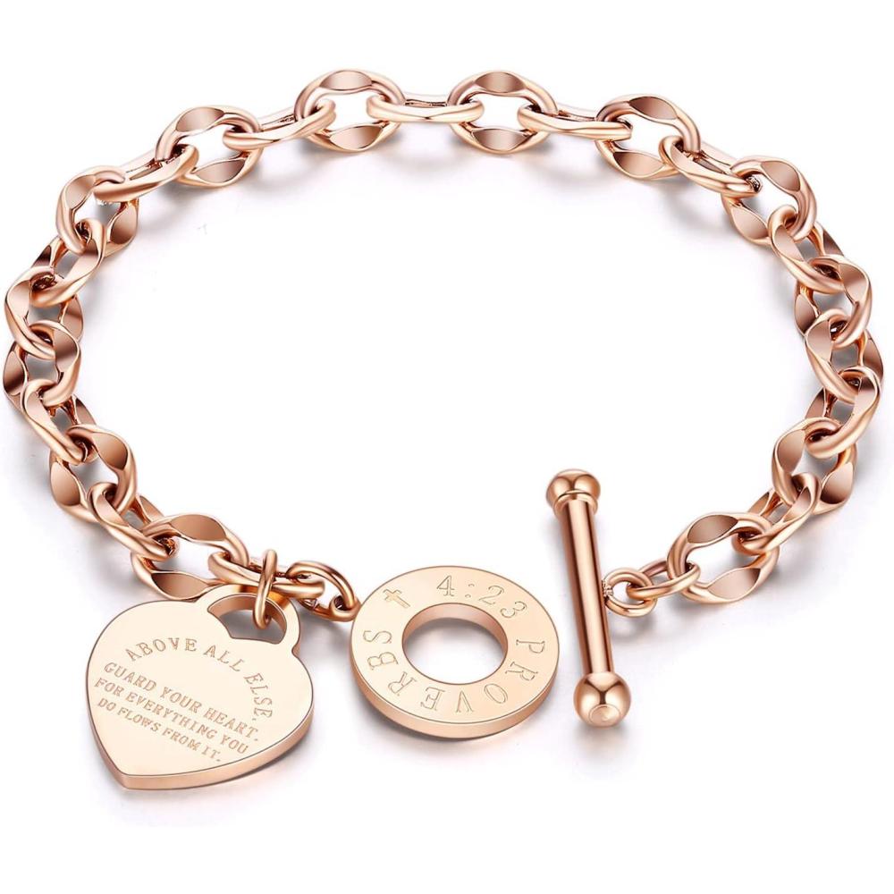 VQYSKO Heart Charm Bracelet for Women-18k Gold Plated Silver/Rose Gold OT Clasp Girls Stainless Steel Bangle,Mother’s Day Valentine’s Day Christmas Birthday Gift(Rose Gold)