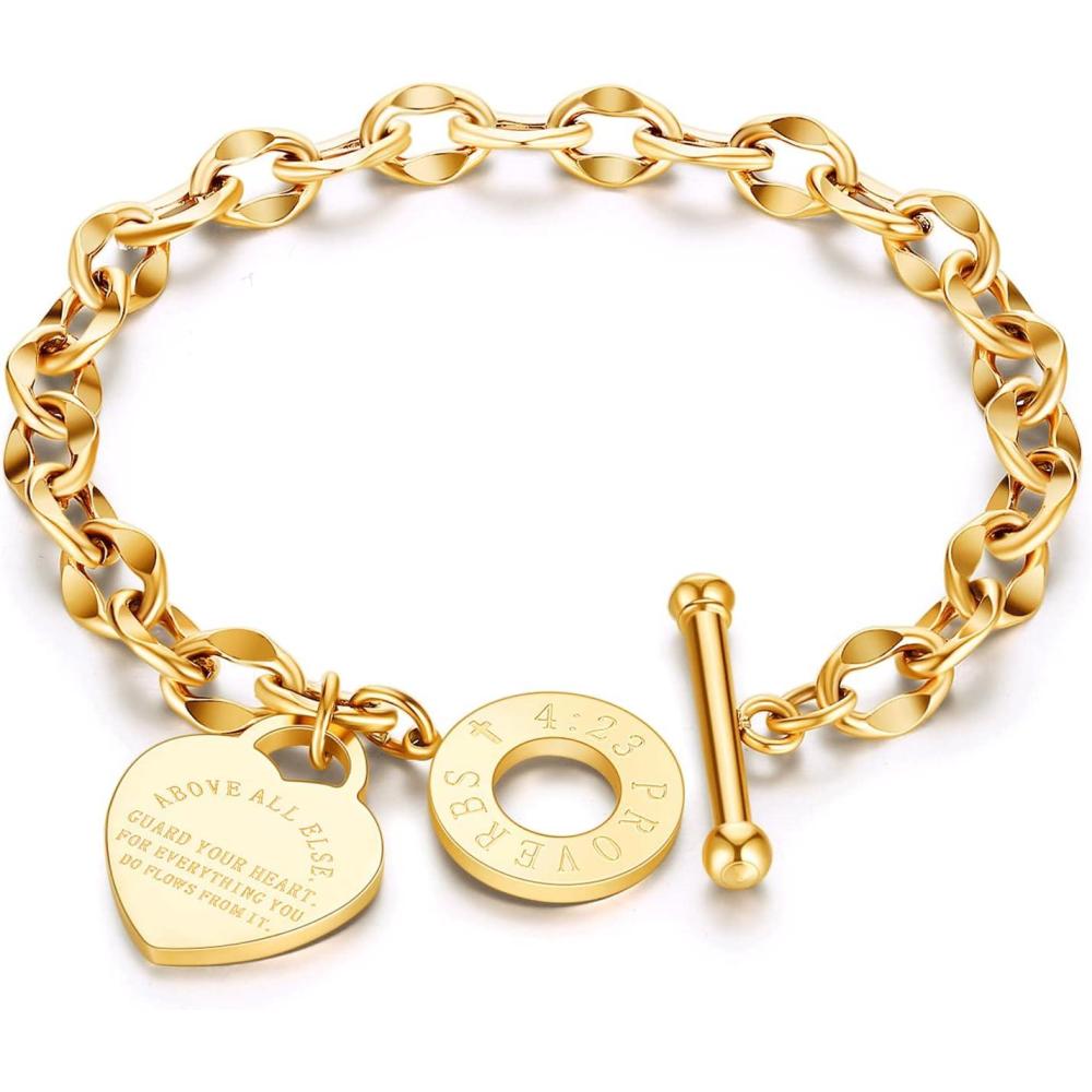 VQYSKO Heart Charm Bracelet for Women-18k Gold Plated Silver/Rose Gold OT Clasp Girls Stainless Steel Bangle,Mother’s Day Valentine’s Day Christmas Birthday Gift(Gold)