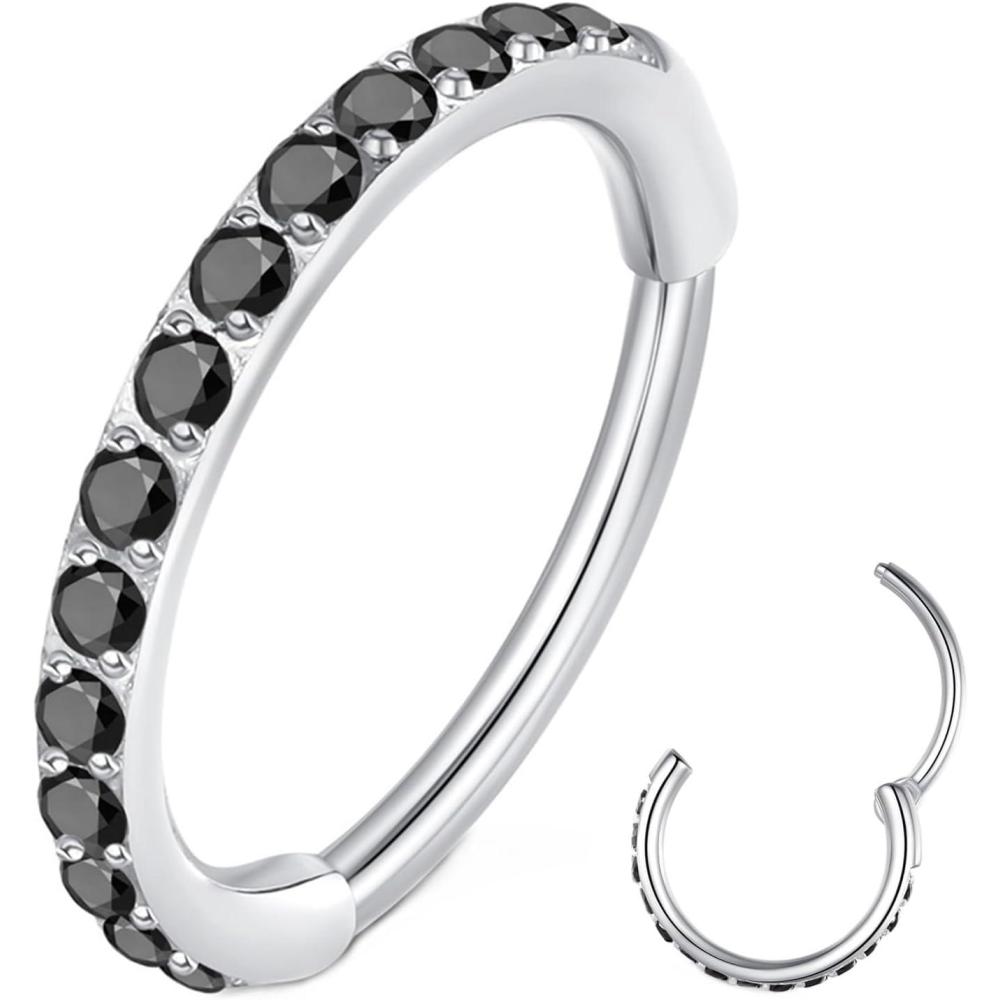 ORANGELOVE 20G 18G 16G Clear CZ Nose Ring Hoop 316L Surgical Steel Seamless Silver Septum Ring Clicker Jewelry Cartilage Earring Ear Piercing Hoop Earrings for Women Men Helix Rook Lobe Conch Tragus Daith Lip Hinged Piercing Jewelry with Cubic Zirconia(1pc/Black CZ 20G 8mm Silver)